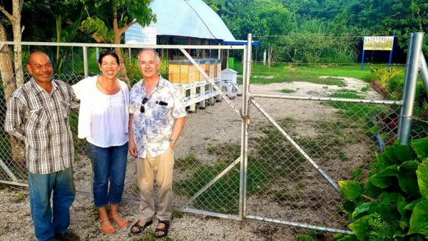 Lopeti, Debra Allan (Ohai Board Secretary), and David at the Tupou College site. Toloa Rain Forest regeneration project opened in 2018 by Prince Harry and Meghan. Our hives behind.
